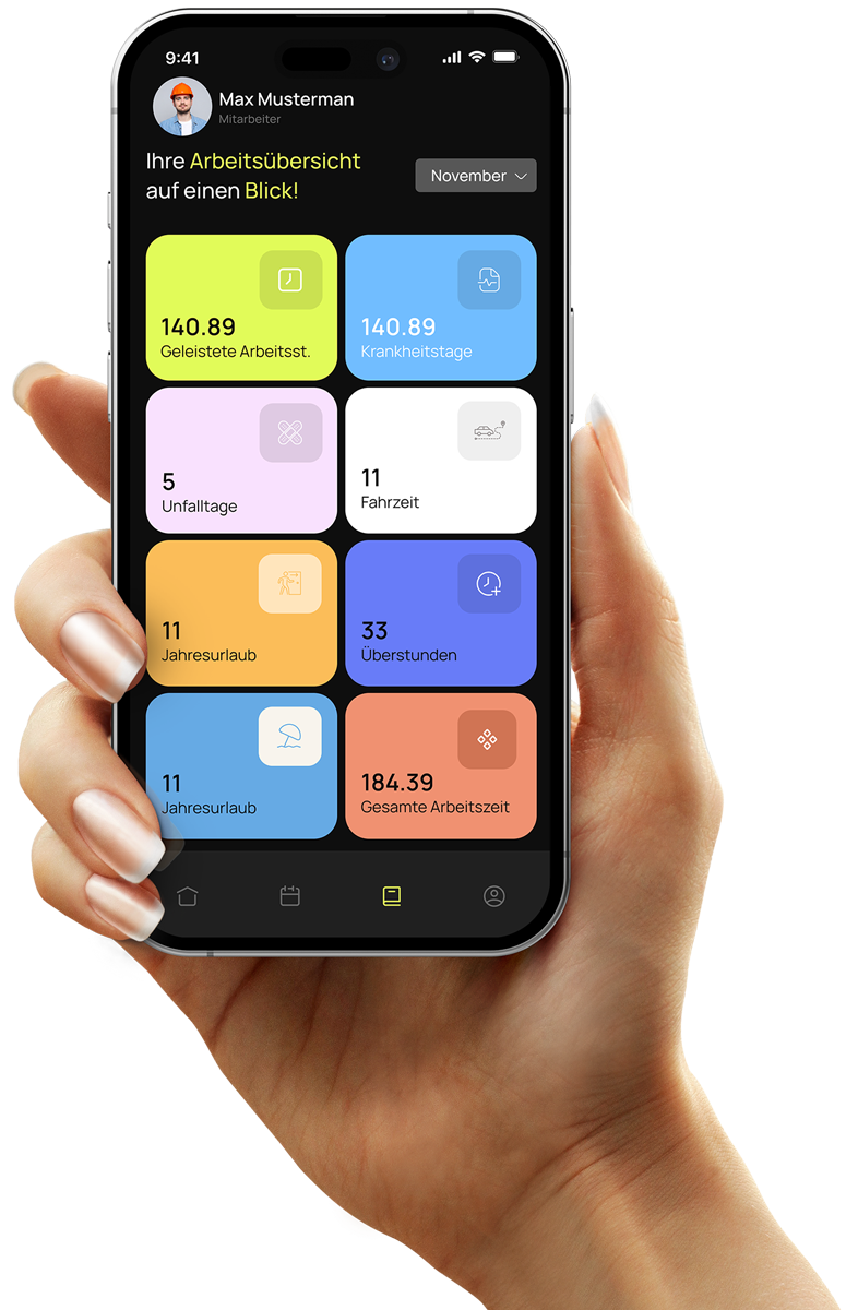 Das Manager-Dashboard bietet einen klaren Echtzeit-Überblick über Mitarbeitende, Projekte, Arbeitszeiten und alle wichtigen KPIs: für eine schnelle, effiziente und papierlose Verwaltung.