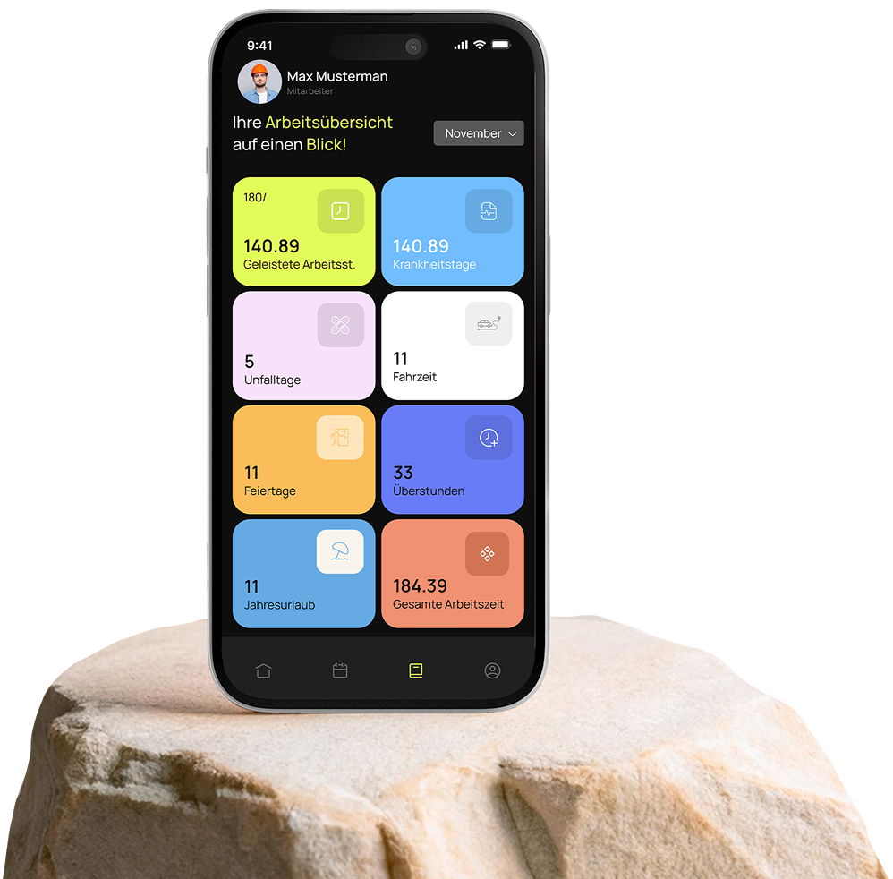 - Projektstunden liveWelche Baustelle. Wie viele Stunden. Wer gearbeitet hat.